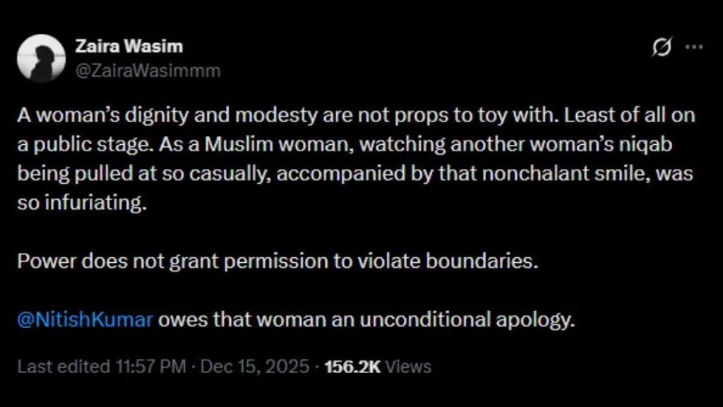 ज़ायरा वसीम ने बिहार के मुख्यमंत्री से माफी मांगने की मांग की