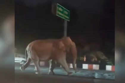 मार्ग पर अचानक आया हाथी, वाहन चालकों में मची अफरा-तफरी; गजराज ने भी लगाई दौड़